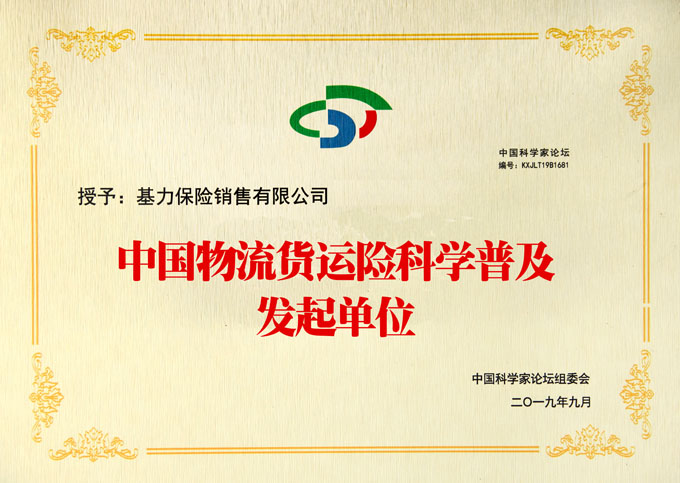中国物流货运险科学普及工程倡议发起单位-证书